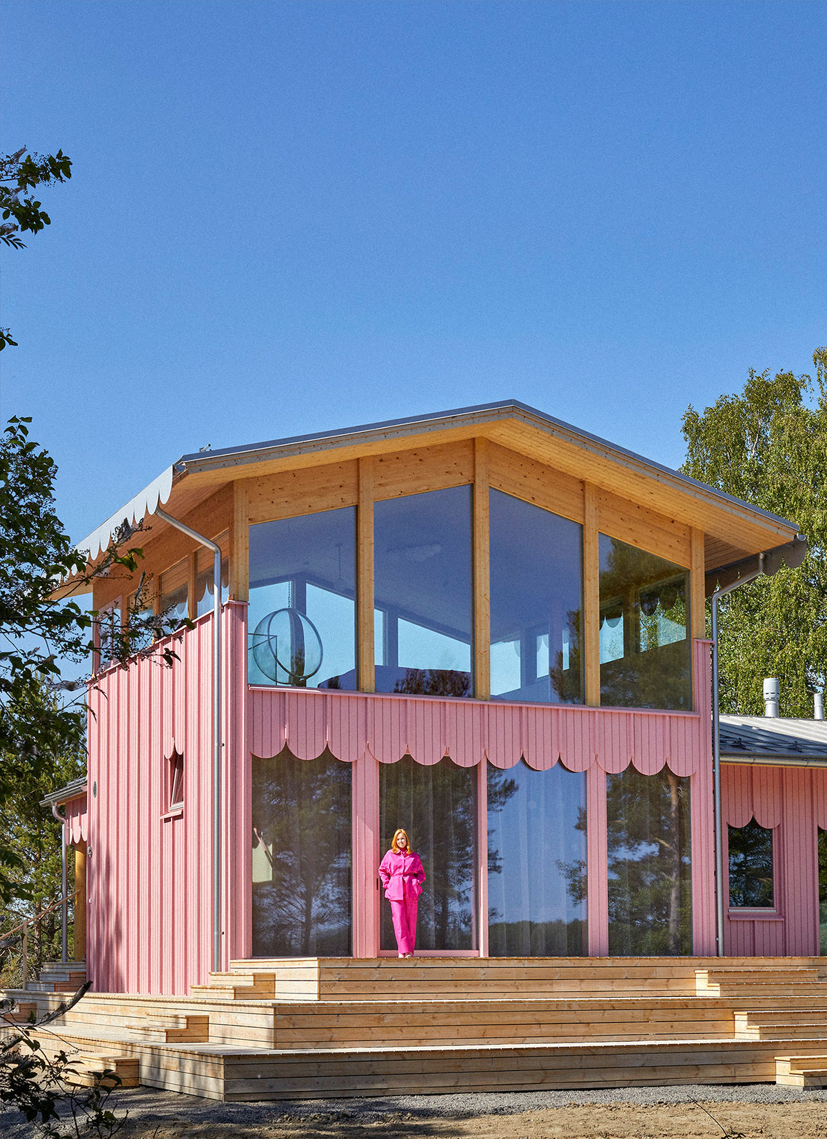 Villa Luella är ett 170 kvm stort hus i korslimmat trä med rosa träfasad, beläget i den finska skärgården. Jumbostora pepparkaksformer ramar in fönstren och husets nederkant, vilket ger detta moderna hus en lekfull och tecknad känsla. Genom att använda trä tillsammans med olika nyanser av rosa skapas en lugnande miljö som är designad från mor till dotter. Minna har byggt huset för sig själv och sin 5-åriga dotter Luella med högkvalitativa material.